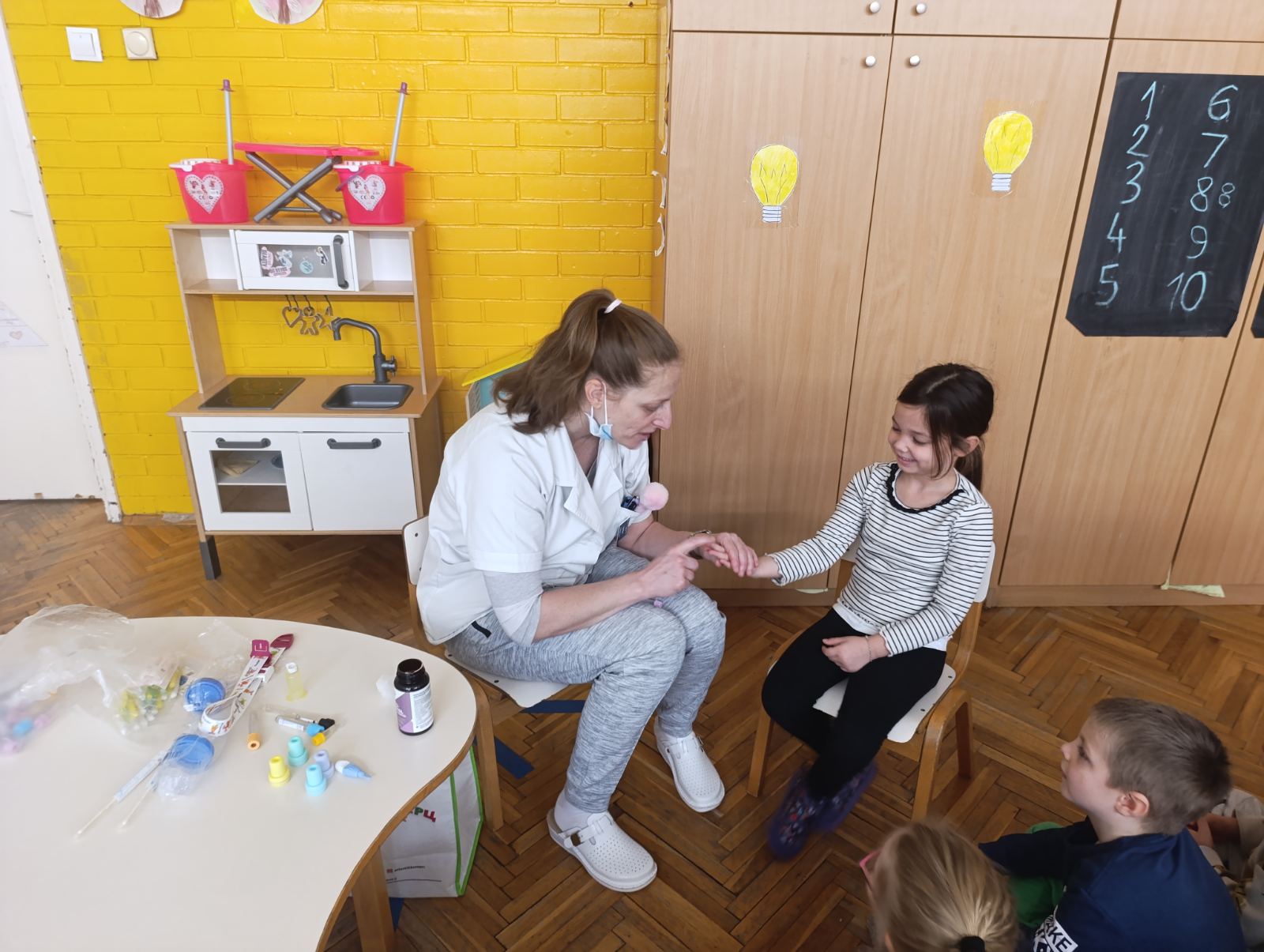 Упознала је децу са појмовима лаборант, епрувете, микроскоп, брис,бактерије... Свако дете је имало прилику да учествује у "кобајаги вађењу крви" из прста и вене.