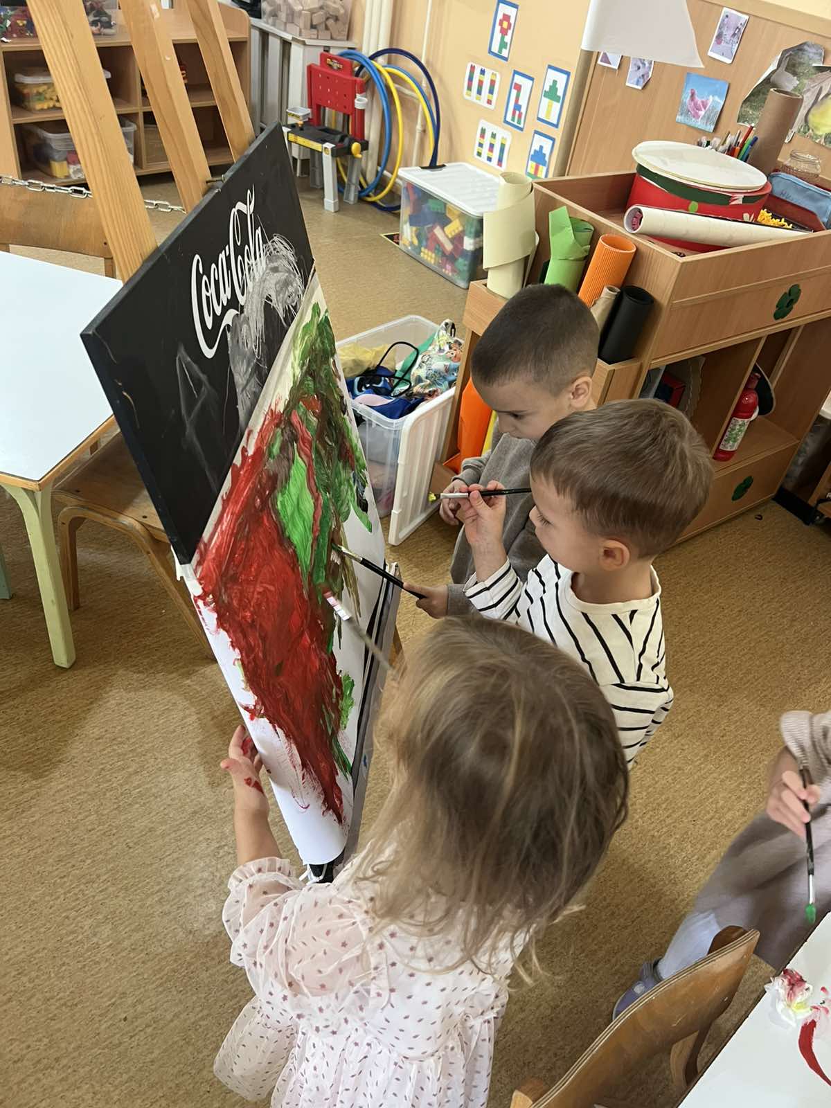 У оквиру пројекта „Шта све могу да сликам?“ предшколска група је испробала нову технику сликања тушевима у боји уз помоћ сламчица. На белим листовима папира, деца су нанела капљицу туша у боји, а потом дувала у ту капљицу уз помоћ сламчице. Капљица би се разлила и направила различите занимљиве облике. Децу је тај процес подстакао на причу на шта их подсећа тај облик и како мешањем две боје, настаје трећа, потпуно нова