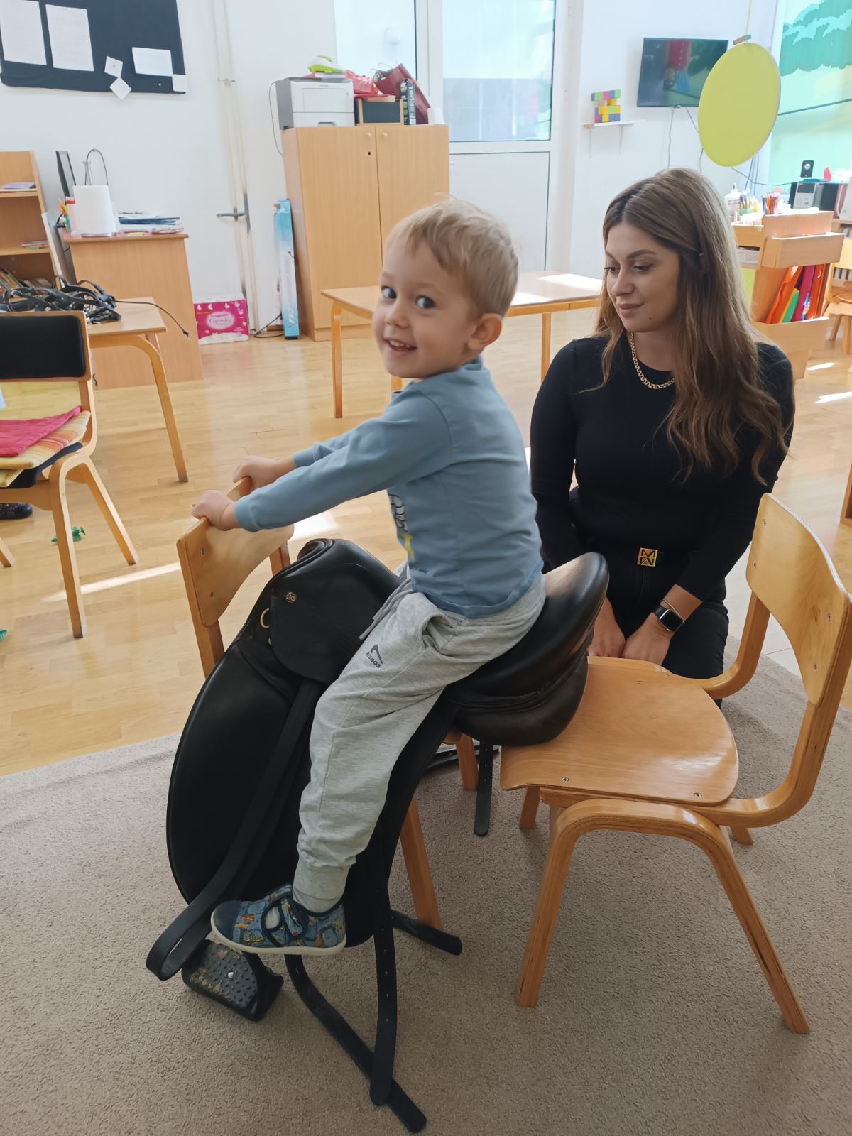 које су подстакле емпатију и заједништво.Том приликом смо однели и пакете обуће, одеће и играчака за децу без родитељског старања, које смо током недеље сакупили у хуманитарној акцији у нашем вртићу. Програм је обогаћен и посетом ПТТ музеју, где су деца кроз интерактивно вођење откривала како функционише поштански систем и како су се некада слале поруке.У сарадњи са родитељима организоване су креативне радионице са јесењим материјалима – лишћем, плодовима и гранчицама – где су настали прави мали уметнички радови. Маскенбал је донео шаренило костима, радост покрета и пуно смеха. Посебну чаролију унела је посета једног тате хармоникаша, који нас је упознао са хармоником и који је својим свирањем оживео атмосферу и подстакао децу на игру и песму. Један од занимљивијих тренутака био је долазак маме – инструкторке јахања, која је у вртић донела право седло! Деца су са одушевљењем испитивала опрему, учила о бризи за коње и маштала о јахању, чиме је ова активност подстакла и разговор о животињама, одговорности и повезаности са природом.