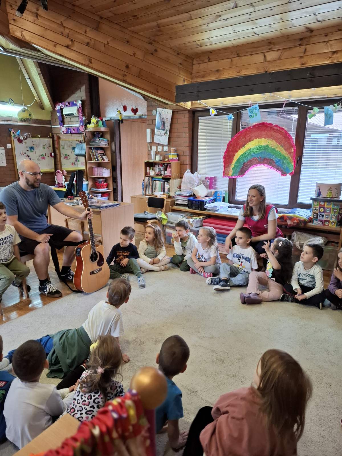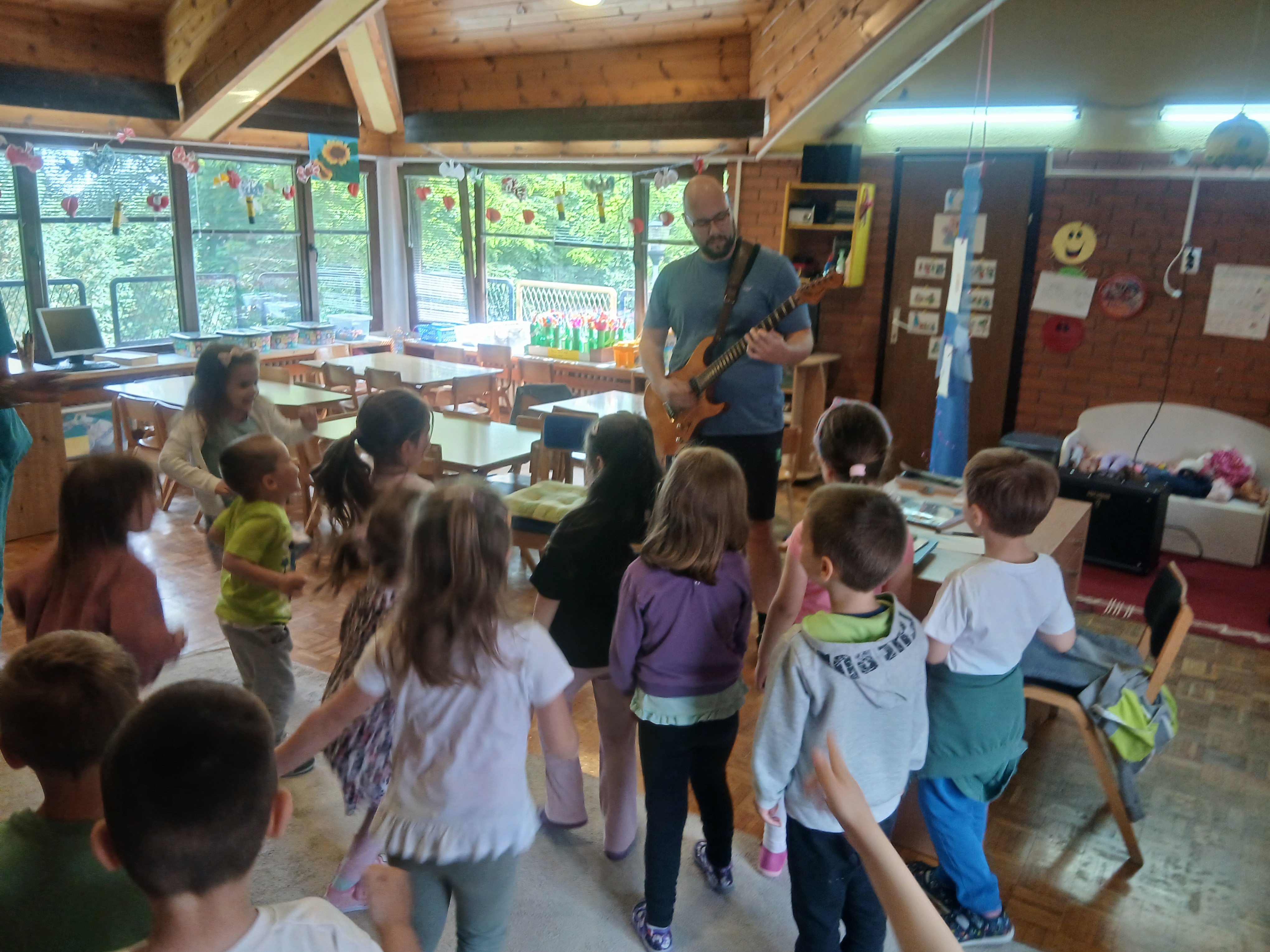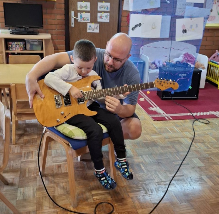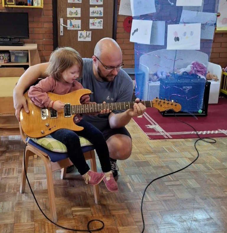 Пролећни пројекат ,,Шта то вири? Ко се чује? Где се крије? Пролеће се осмехује“ је покренуо децу на истраживање природе, звукова из природе и интересовање за певушење дечијих песама о пролећу и инсектима. У сарадњи са оцем детета Ј.Г., који је музичар, организујемо његово гостовање у нашој средњој групи. Представио нам је своје музичке инструменте: акустичну и електричну гитару и убрзо посету претворио у концерт пролећних песама. Деца су играла, певала и имала прилику да се опробају у свирању гитаре. Створена је позитивна и разиграна атмосфера.