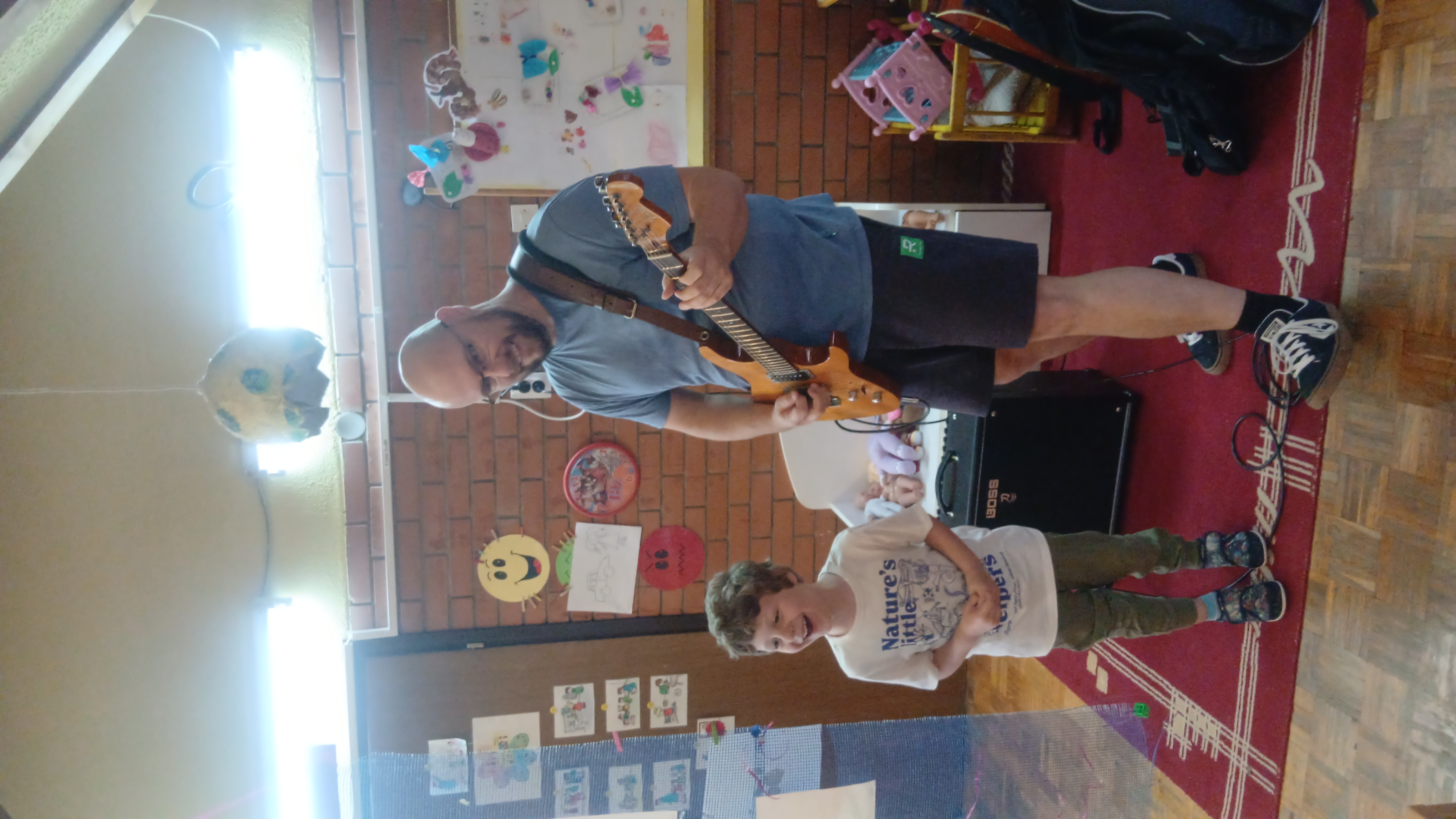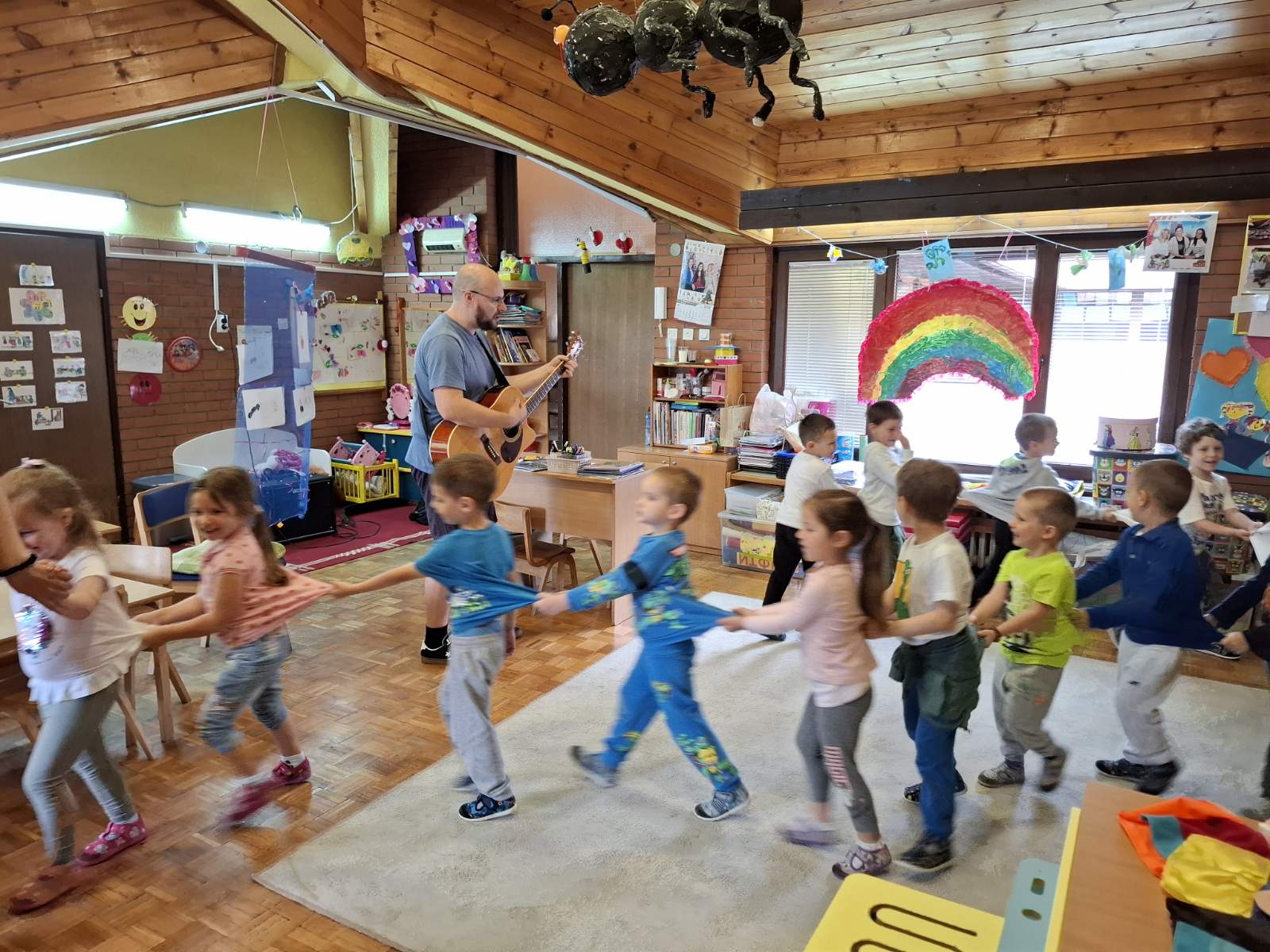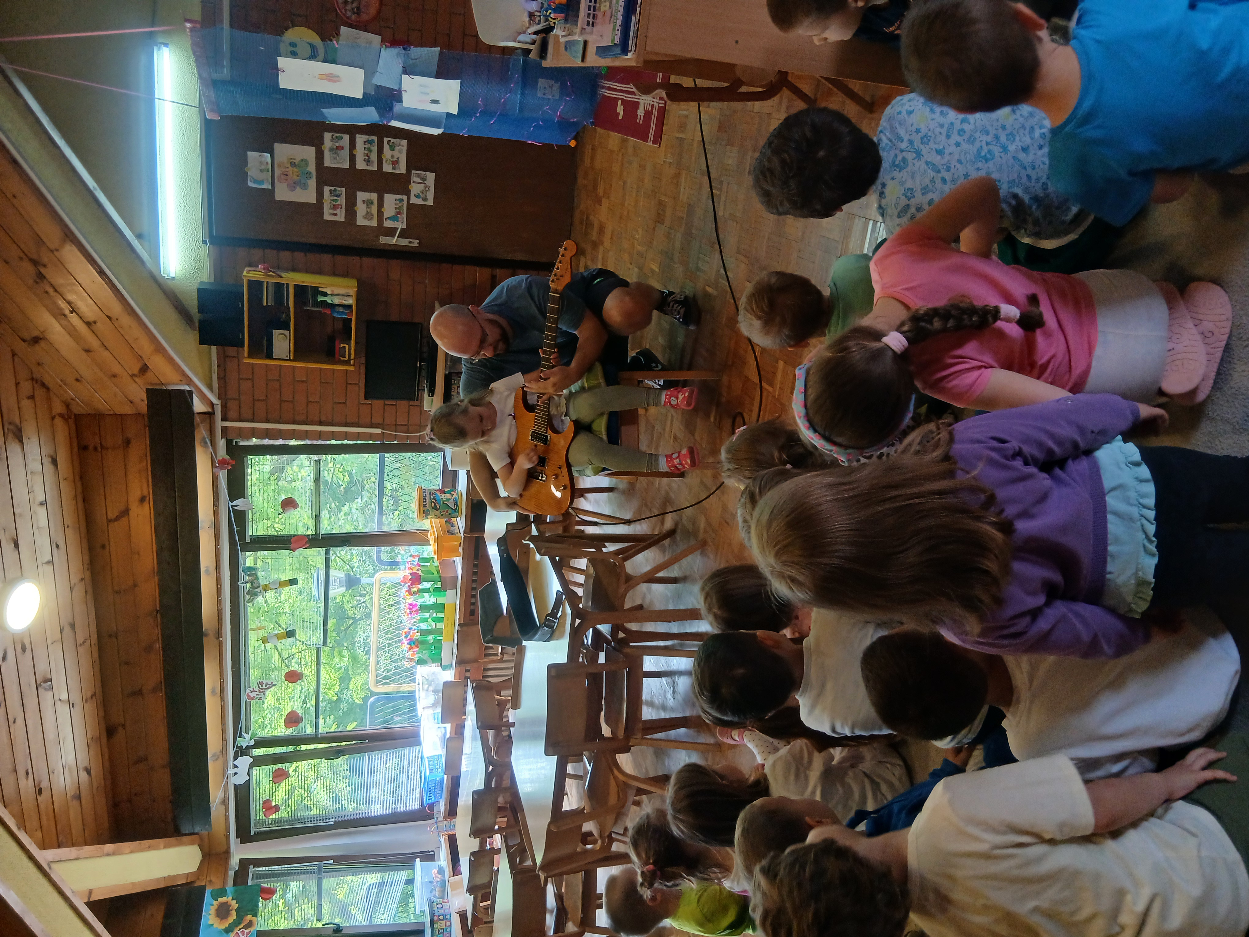 Пролећни пројекат ,,Шта то вири? Ко се чује? Где се крије? Пролеће се осмехује“ је покренуо децу на истраживање природе, звукова из природе и интересовање за певушење дечијих песама о пролећу и инсектима. У сарадњи са оцем детета Ј.Г., који је музичар, организујемо његово гостовање у нашој средњој групи. Представио нам је своје музичке инструменте: акустичну и електричну гитару и убрзо посету претворио у концерт пролећних песама. Деца су играла, певала и имала прилику да се опробају у свирању гитаре. Створена је позитивна и разиграна атмосфера.