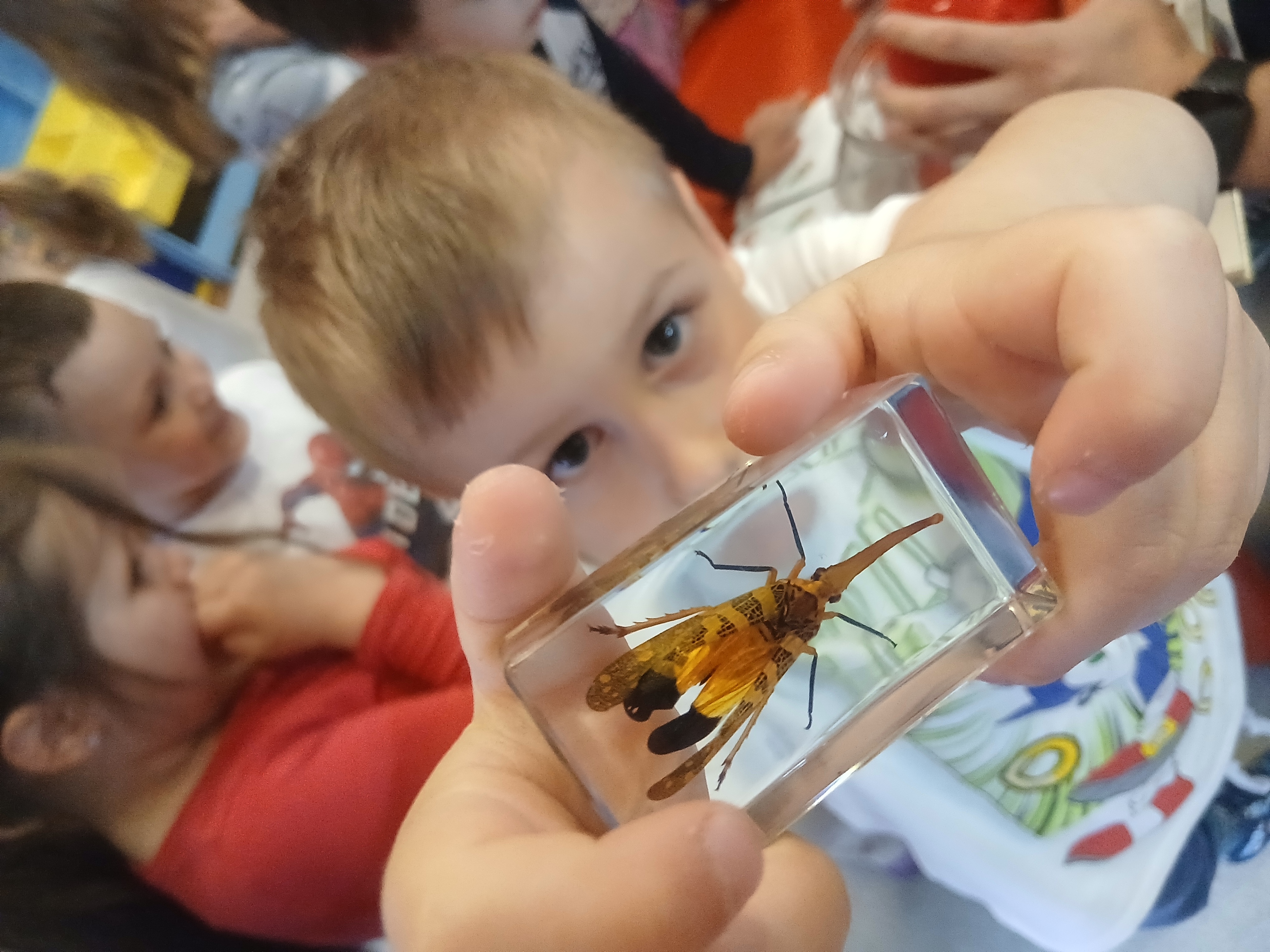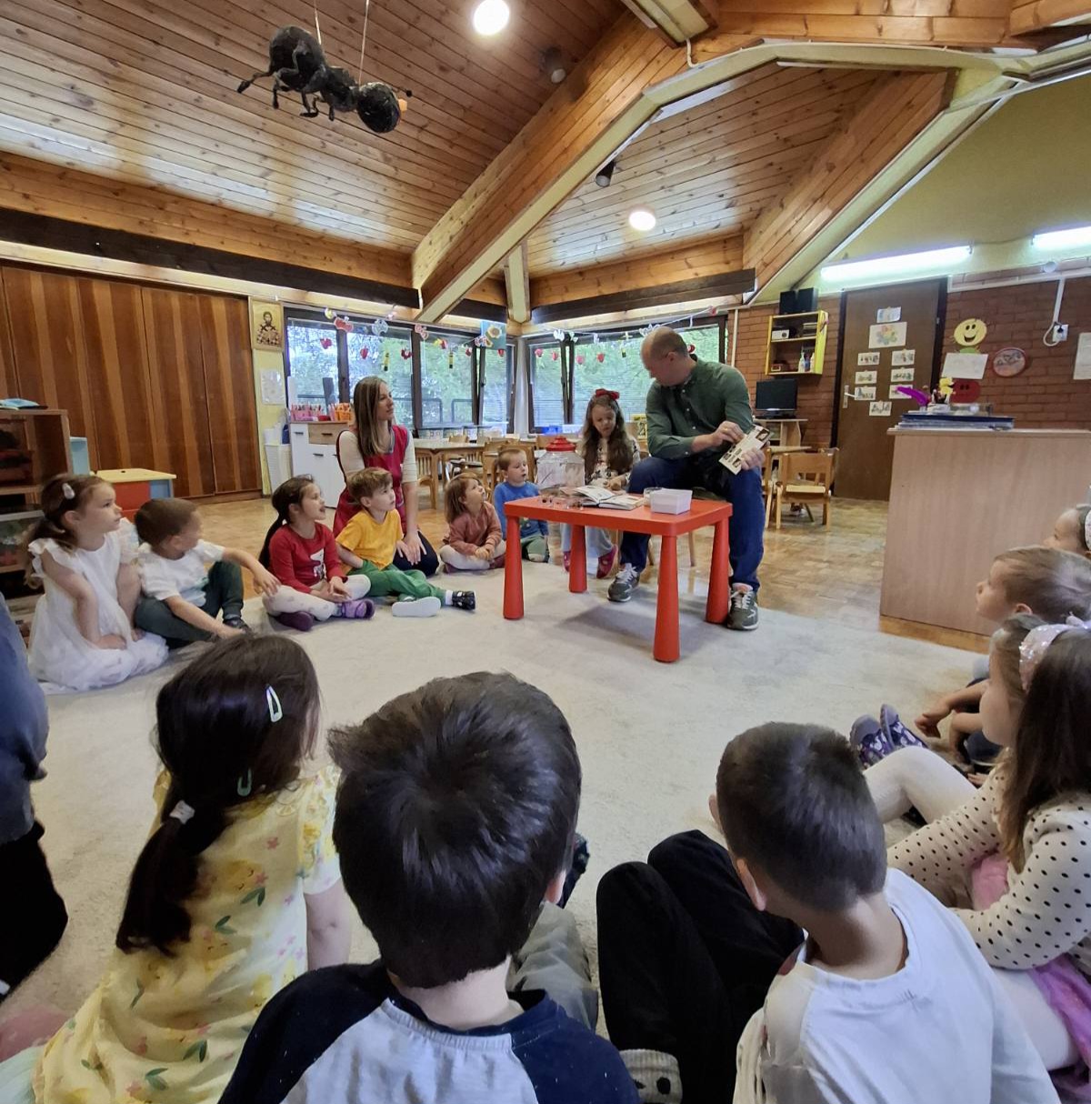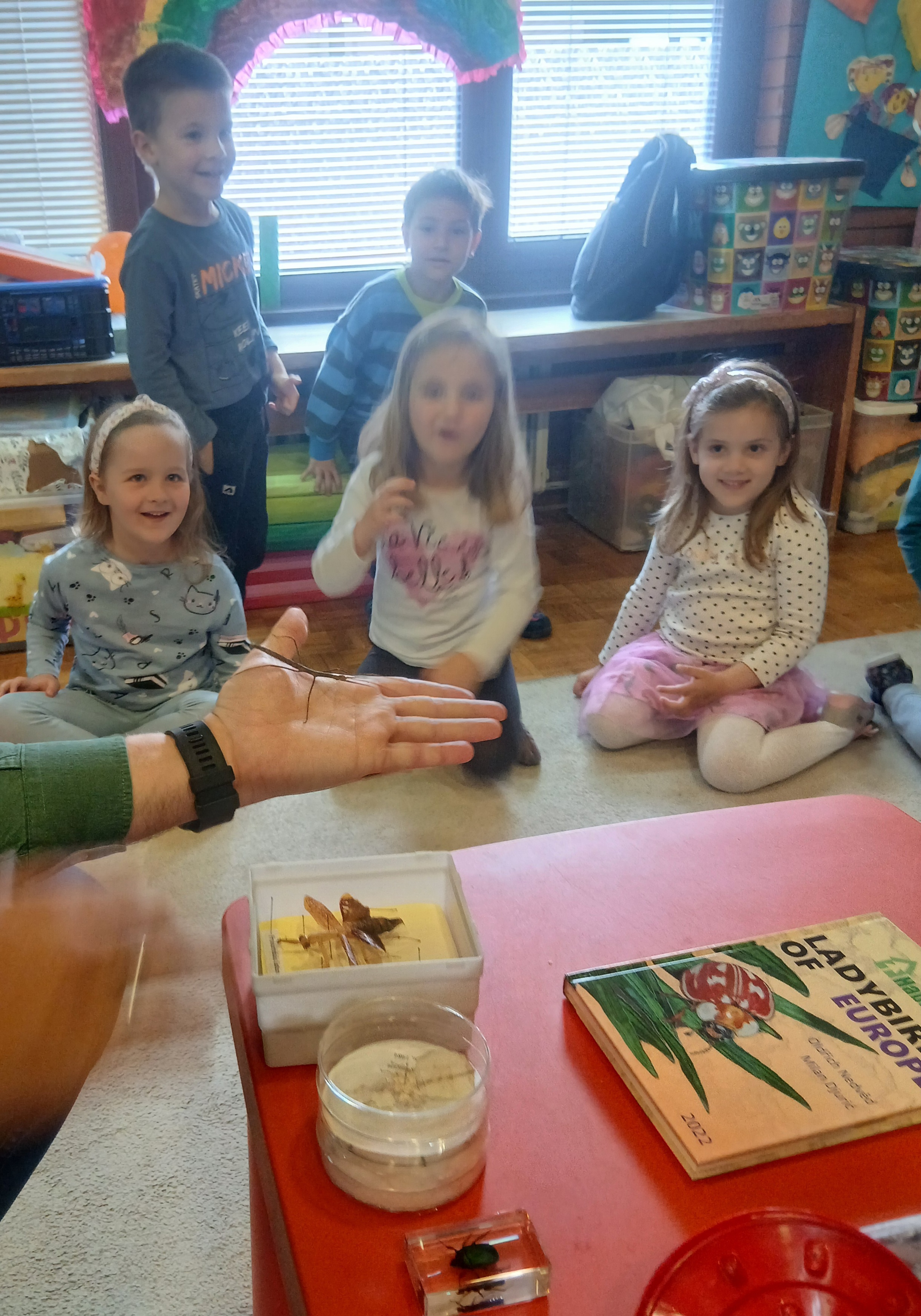инсект, како мрави чувају јаја лептира, посматрали препариране инсекте? Разгледали смо сликовите енциклопедије и имали прилику да нам гост у групи буде и велика буба гранчица која је на децу оставила посебан утисак и помоћ у превазилажењу страха од бубица који постоји код неке деце.