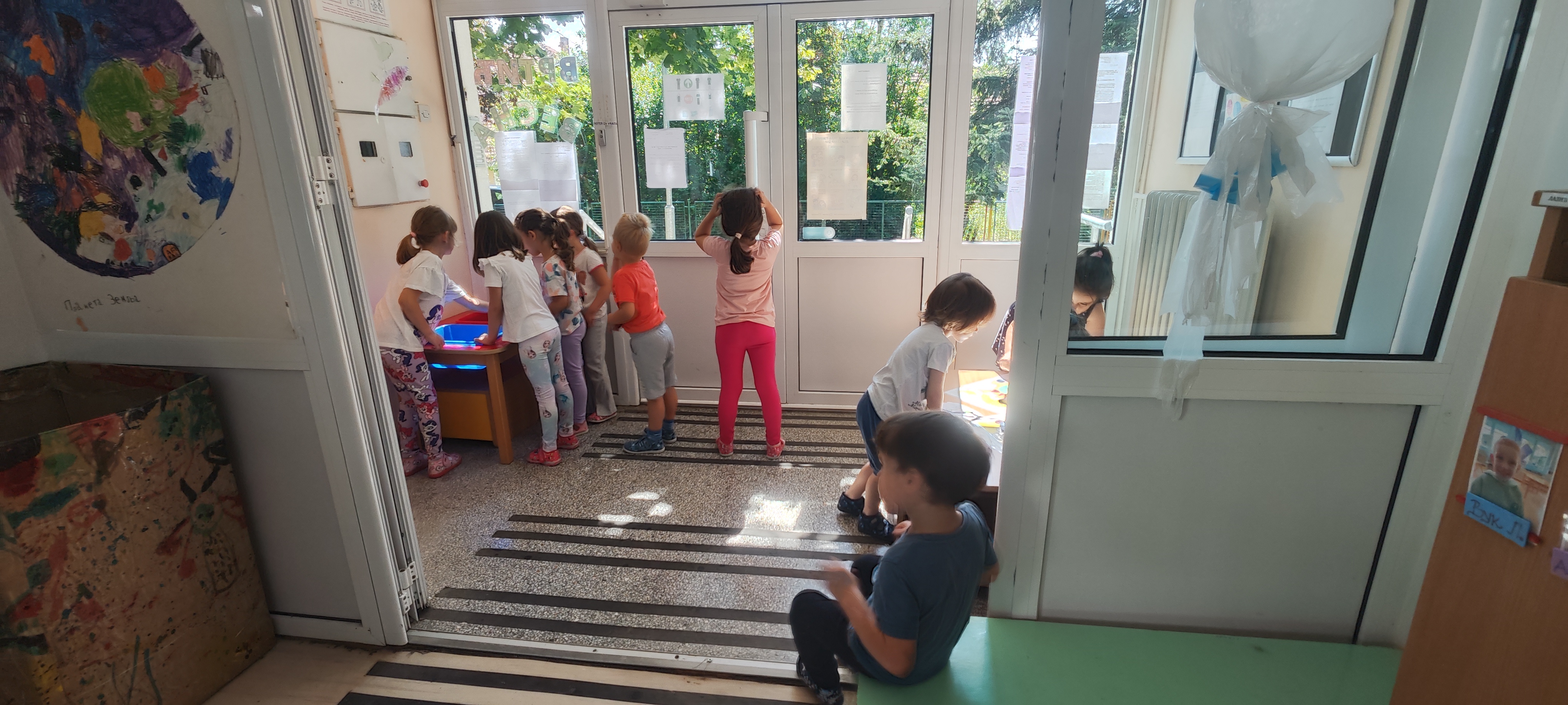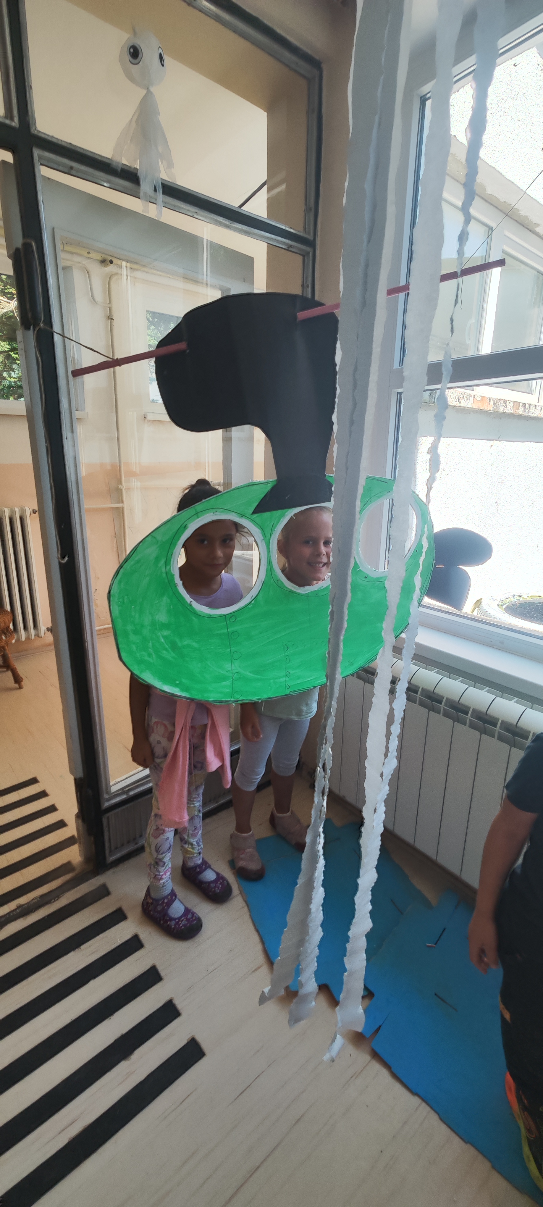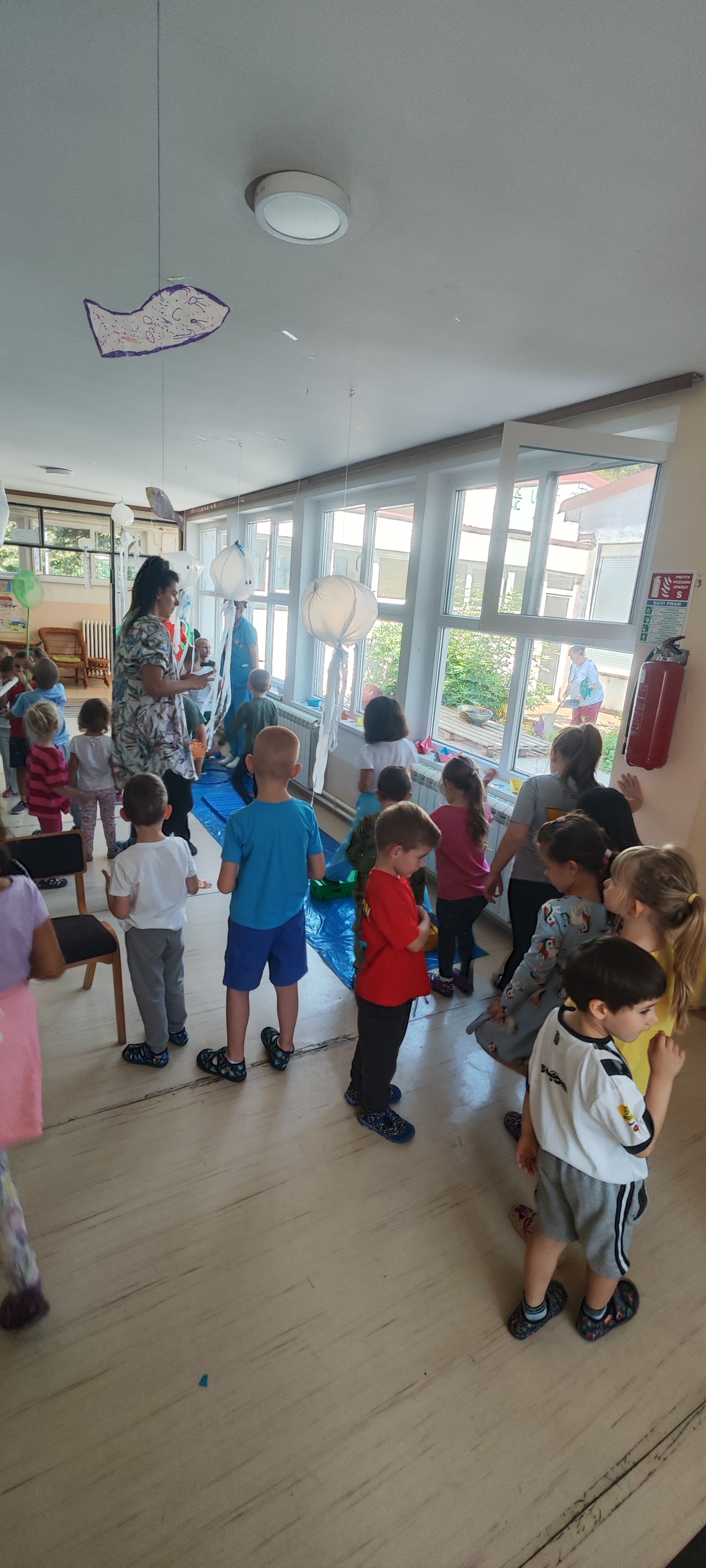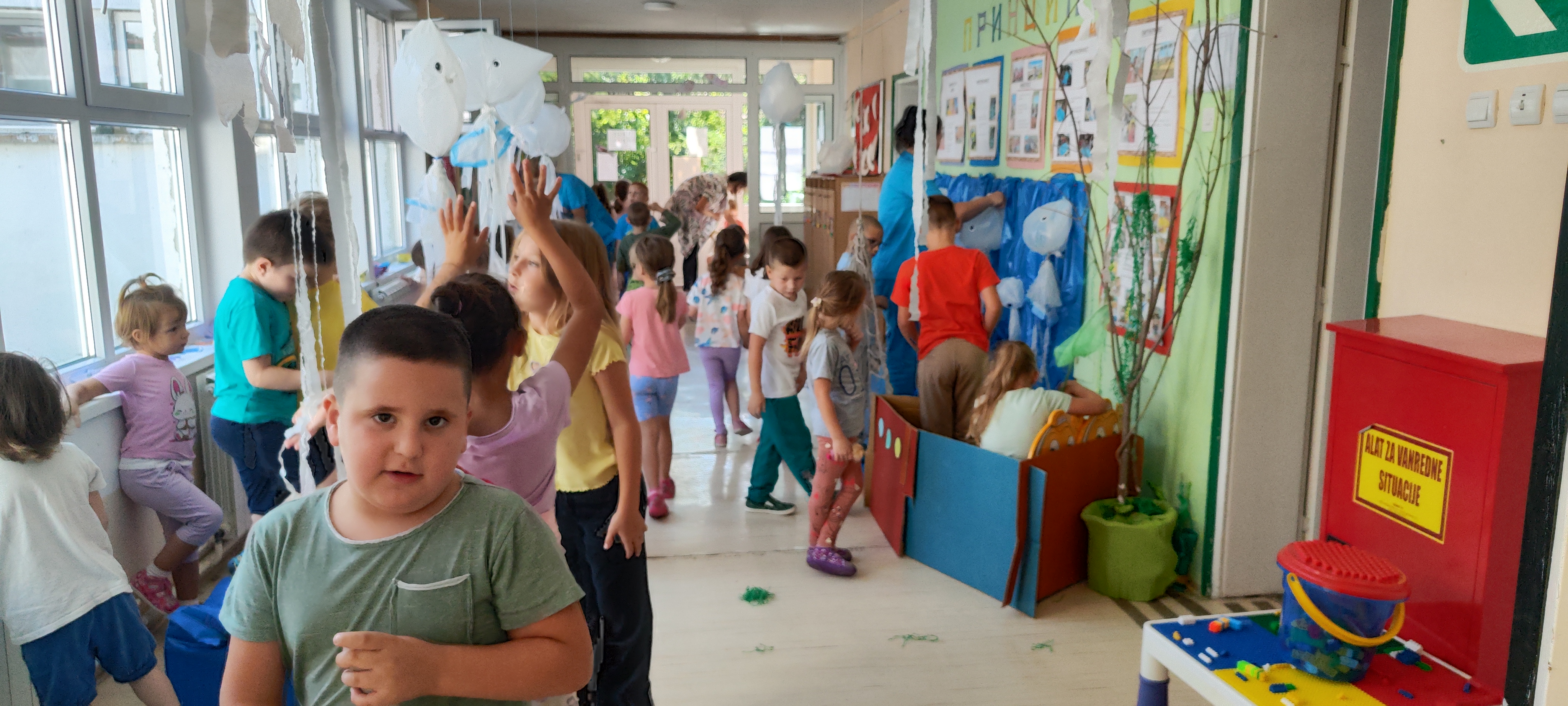 Ходник је постао подводни свет! Плави таласи од најлона, медузе од кеса и трака, рибе обојене дечијом руком.