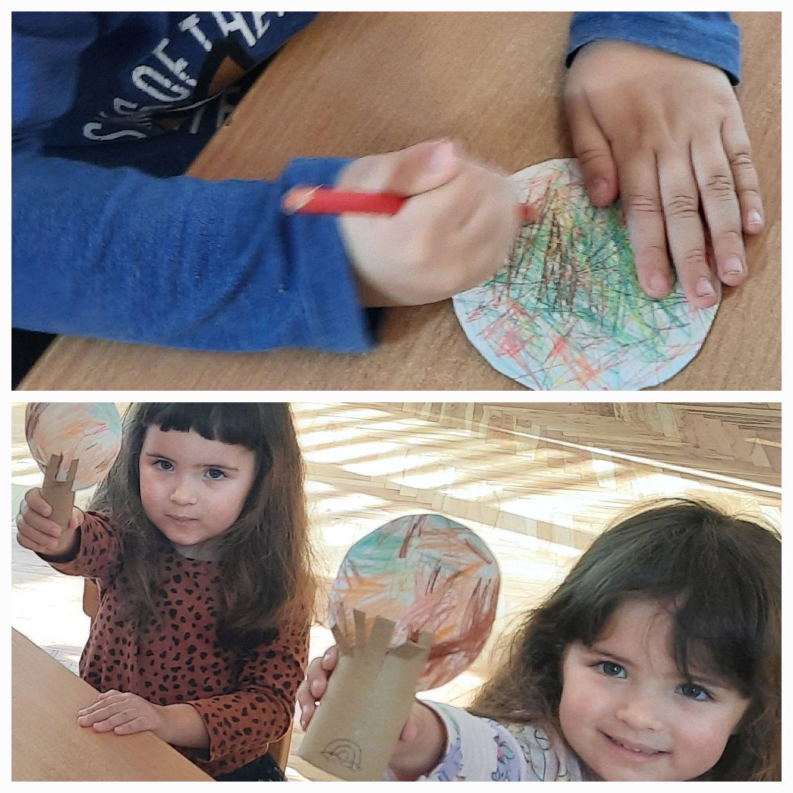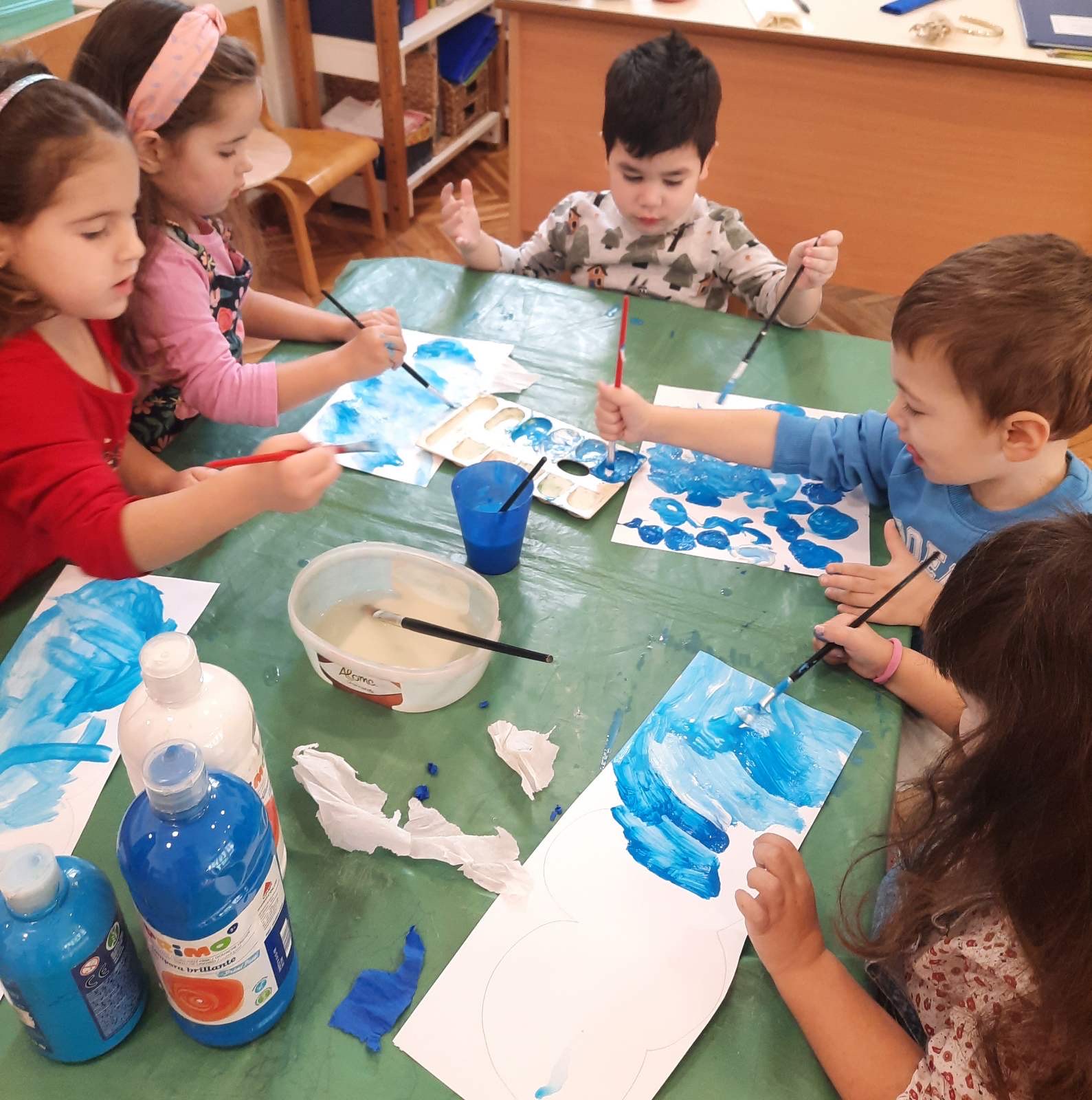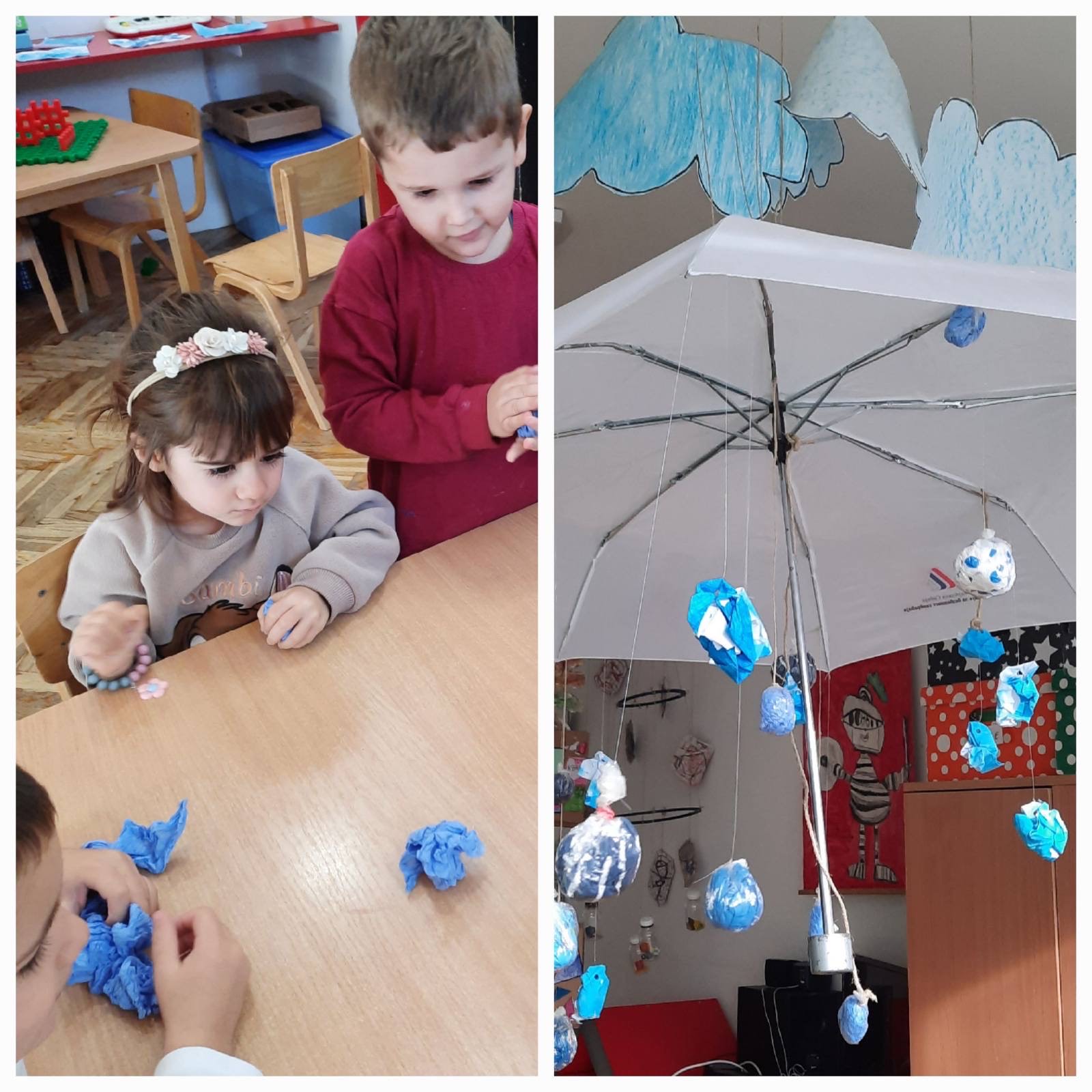 Наредних дана од рециклажних и природних материјала у радној соби смо правили кућицу у шуми и изложили је у предпростору собе. Уследили ду кишни дани и подстакли нас да правимо облаке и кишне капи.