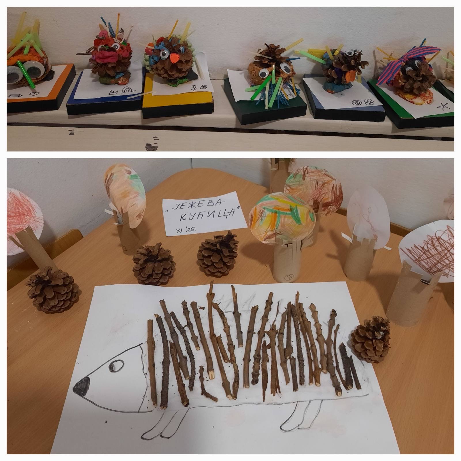 Након позоришне представе "Јежева куцица", боравили смо у дворишту вртића и од природних материјала правили кућицу за јежа.