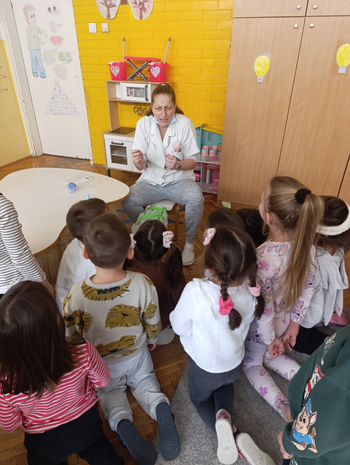 Упознала је децу са појмовима лаборант, епрувете, микроскоп, брис,бактерије... Свако дете је имало прилику да учествује у "кобајаги вађењу крви" из прста и вене.