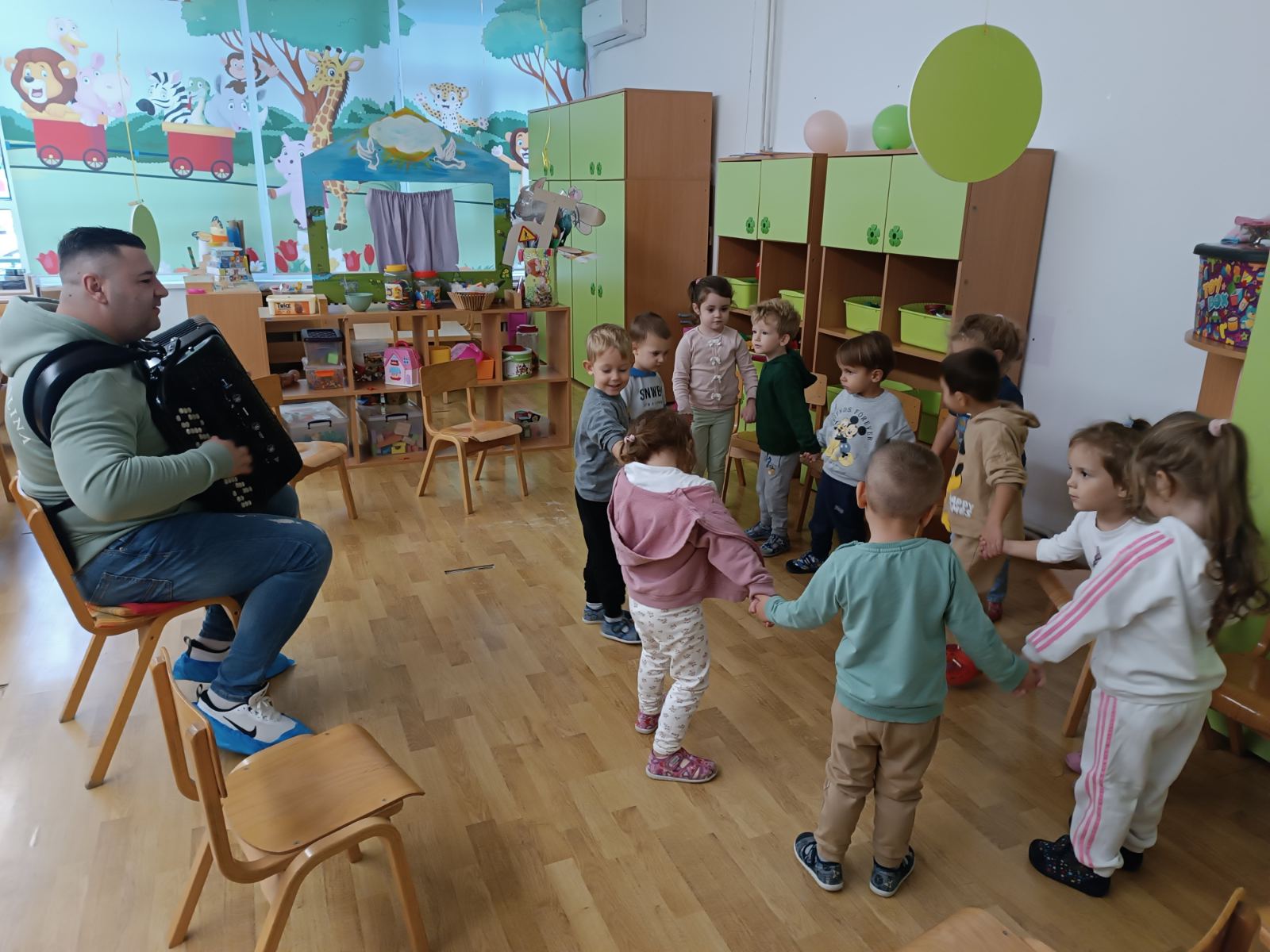 које су подстакле емпатију и заједништво.Том приликом смо однели и пакете обуће, одеће и играчака за децу без родитељског старања, које смо током недеље сакупили у хуманитарној акцији у нашем вртићу. Програм је обогаћен и посетом ПТТ музеју, где су деца кроз интерактивно вођење откривала како функционише поштански систем и како су се некада слале поруке.У сарадњи са родитељима организоване су креативне радионице са јесењим материјалима – лишћем, плодовима и гранчицама – где су настали прави мали уметнички радови. Маскенбал је донео шаренило костима, радост покрета и пуно смеха. Посебну чаролију унела је посета једног тате хармоникаша, који нас је упознао са хармоником и који је својим свирањем оживео атмосферу и подстакао децу на игру и песму. Један од занимљивијих тренутака био је долазак маме – инструкторке јахања, која је у вртић донела право седло! Деца су са одушевљењем испитивала опрему, учила о бризи за коње и маштала о јахању, чиме је ова активност подстакла и разговор о животињама, одговорности и повезаности са природом.