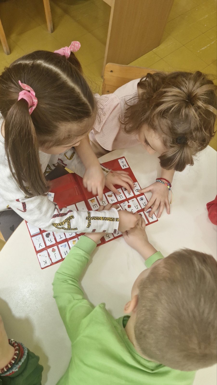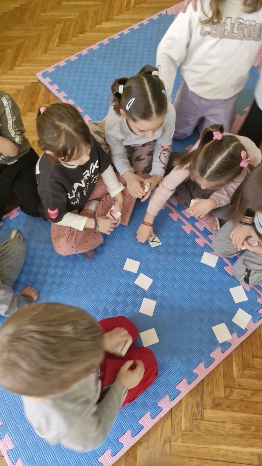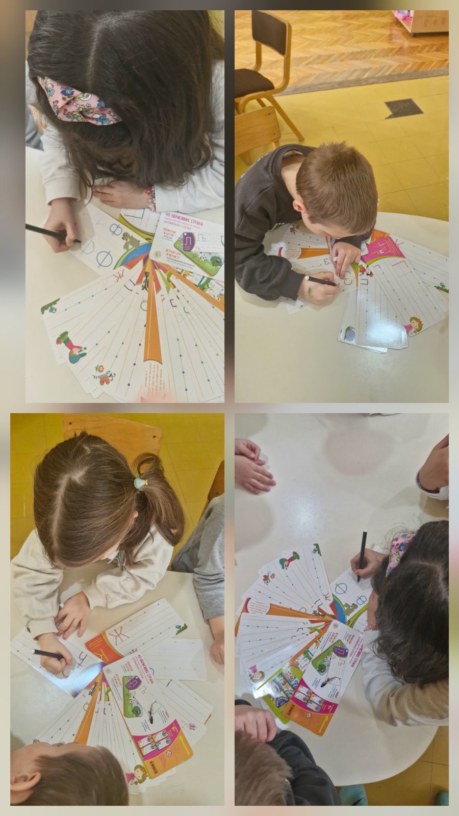 Кроз игру „Наш буквар“ и различите језичке активности, деца су слагала речи од понуђених слова, препознавала почетно слово свог имена, додавала слова како би добила нове речи и у пару извлачила слике на основу којих су састављала речи. Посебну радост донеле су активности у којима су слова стварали на креативан начин – слово А у малим групама, слово И обликовањем тела, као и задаци „пиши-бриши“ и спајање тачкица како би добили тражено слово.