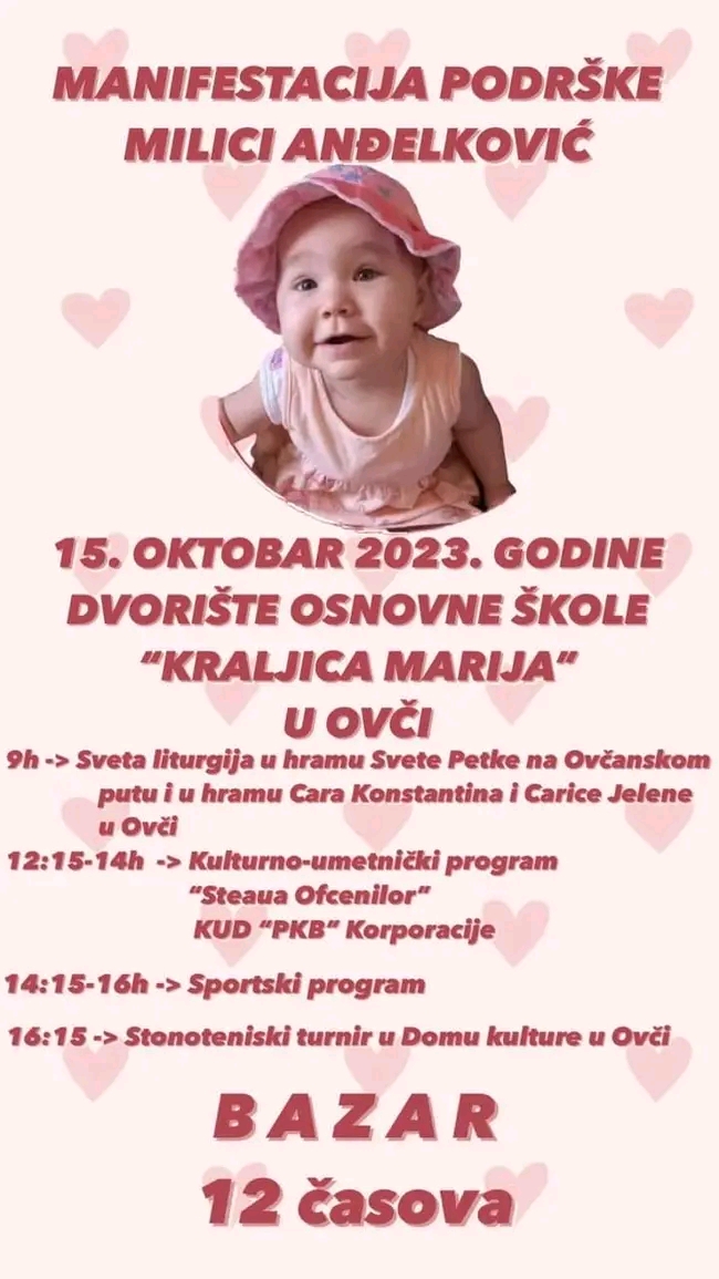 Негде почетком октобра сазнале смо да ће се у Овчи, у дворишту ОШ "Краљица Марија", одржати манифестација подршке Милици Анђелковић, девојчици којој је дијагностикована акутна мијелоидна леукемија са високим ризиком.