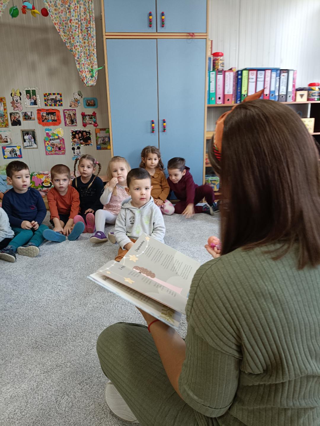 У току недеље новогодишњих активности, организовали смо посету аутора књиге „Бебина ризница“ Адријану Јевтић. Као припрему за ову посету, родитељи су имали задатак да креирају ризницу њиховог детета, која треба да садржи једну или више анегдота као и фотографију која је из периода када су били бебе. Долазак Адријане је изазвао радозналост код деце при самом почетку када их је упознала са слончетом, помоћником у активности, који их је уводио у читање сваке следеће песме из „Бебине ризнице“. Пре читања сваке песме, је припремила уводну активност коју су пратили реквизити који су описани у песми. Деца су била веома мотивисана и активно су учествовали у свакој активности коју је осмилила. Након читања песмица и упознавањем са књигом, Адријана је на врло занимљив начин представљала дечије ризнице. Читањем анегдоте која је написана, деца су имала задатак да препознају чију ризницу представља, што је изазвало много смеха и радозналости код деце. За крај ове посете, ауторка је припремила радионичарски део у коме су деца имала задатак да украсе разним стикерима и бојицама припремљена колица за бебе на штапићу. Ово дружење је протекло у веома пријатној атмосфери, деца су била срећна што су имала могућност да упознају правог писца и да уживају у читању песмица, као и у свим осталим активностима које нам је припремила ауторка књиге „Бебина ризница“.