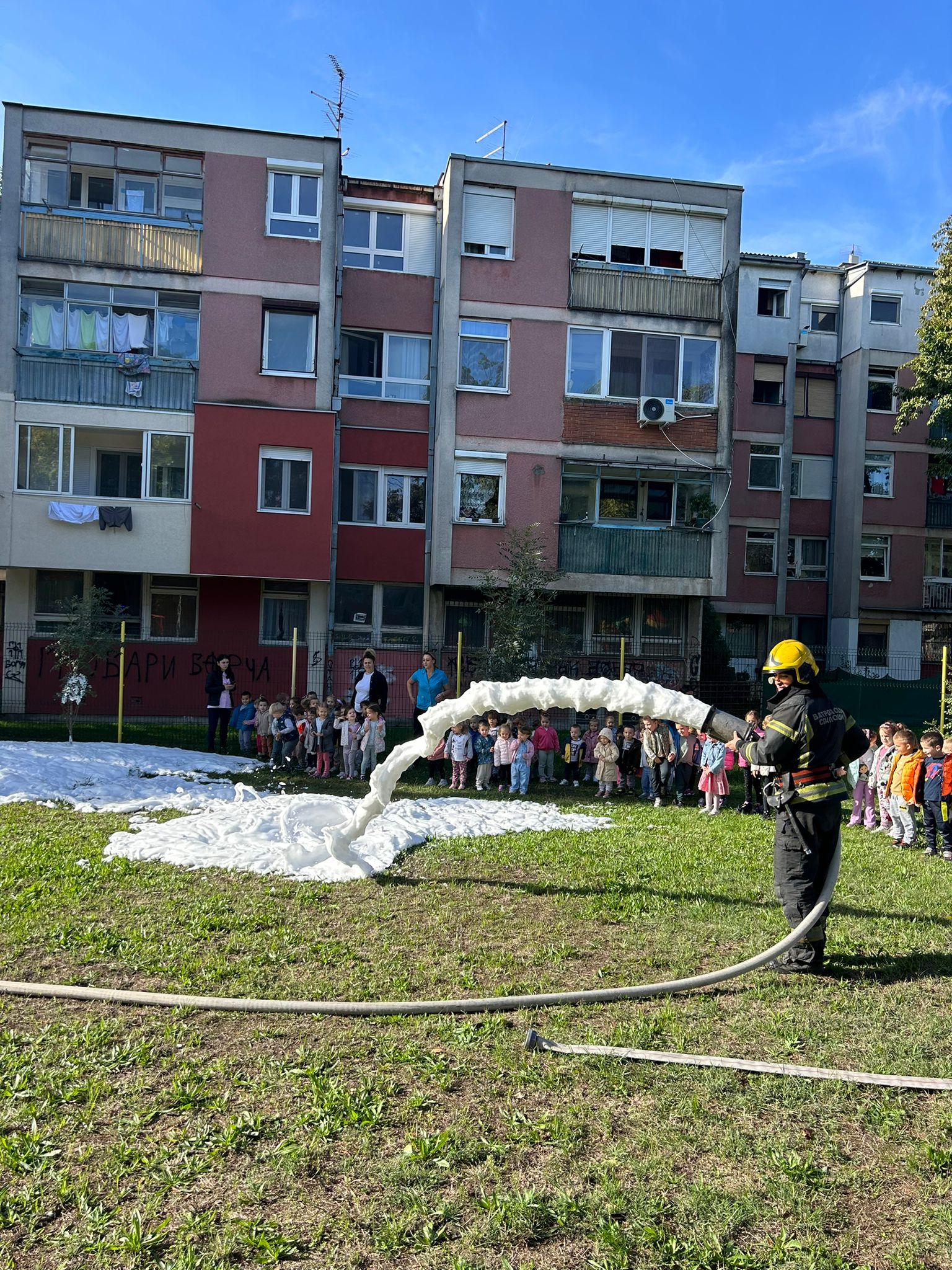 пожара. Звуци ватрогасне сирене и пена за гашење пожара мамили су деци осмехе на