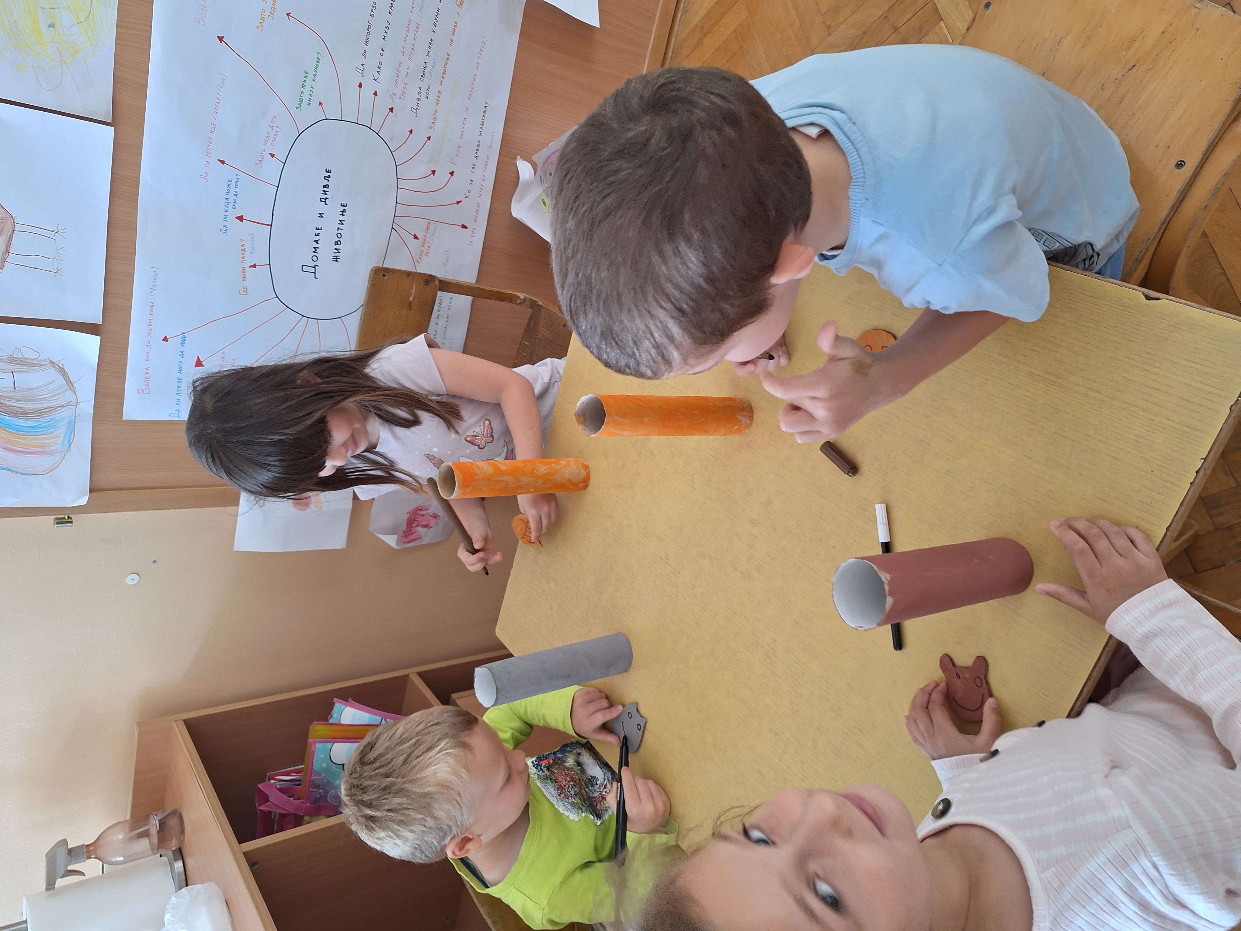 Средња 2 група је наставила свој пројекат „Која животиња где живи“ кроз истраживање дивљих животиња. Правили су зеке, лисице, меде, вукове од ролни убрус папира. Заједно су цртали и бојили пано са шумским животињама, а у слободној игри су врло често опонашали поједине животиње. Учили су нове рецитације и играли спортске полигоне „Крећи се као...“ које је припремила васпитачица.
