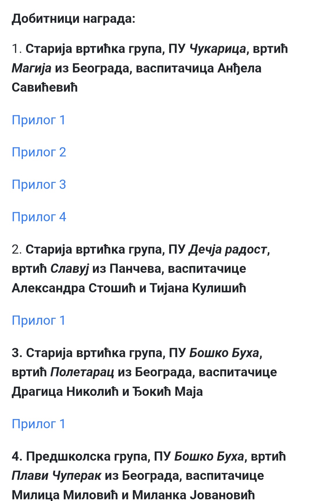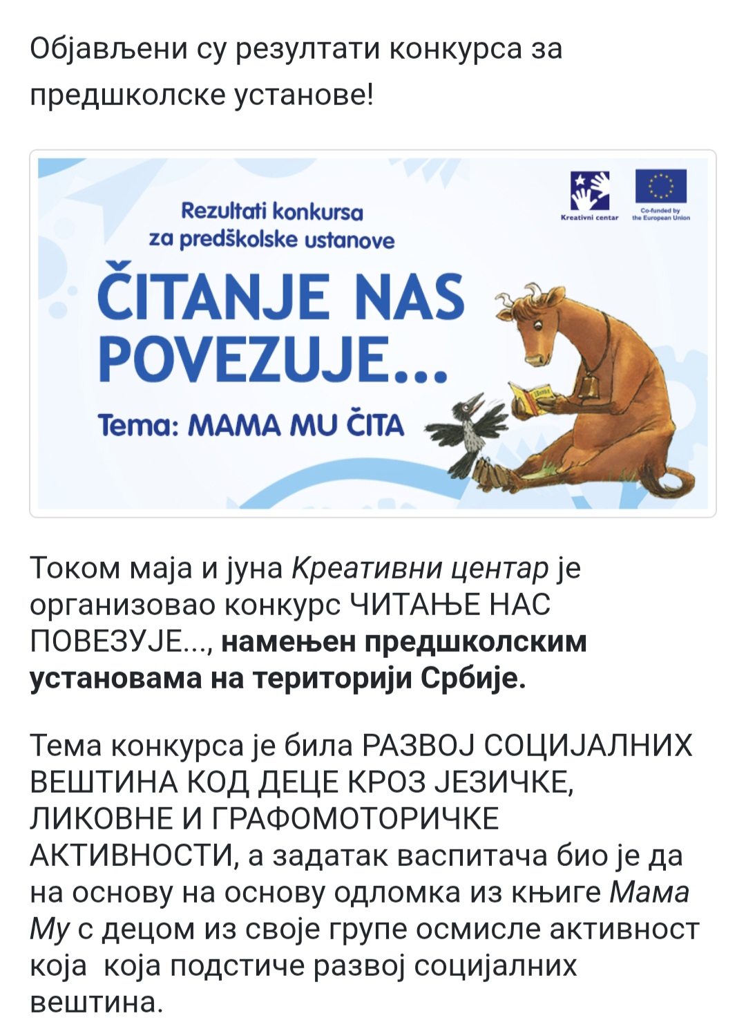 Такође се можемо похвалити и успехом и наградом који је остварила старија група нашег вртића учешћем на конкурсу "Читање нас повезује" Креативни центар. Њихов рад је одабран од стране стручног жирија и награђен од стране Креативног центра.