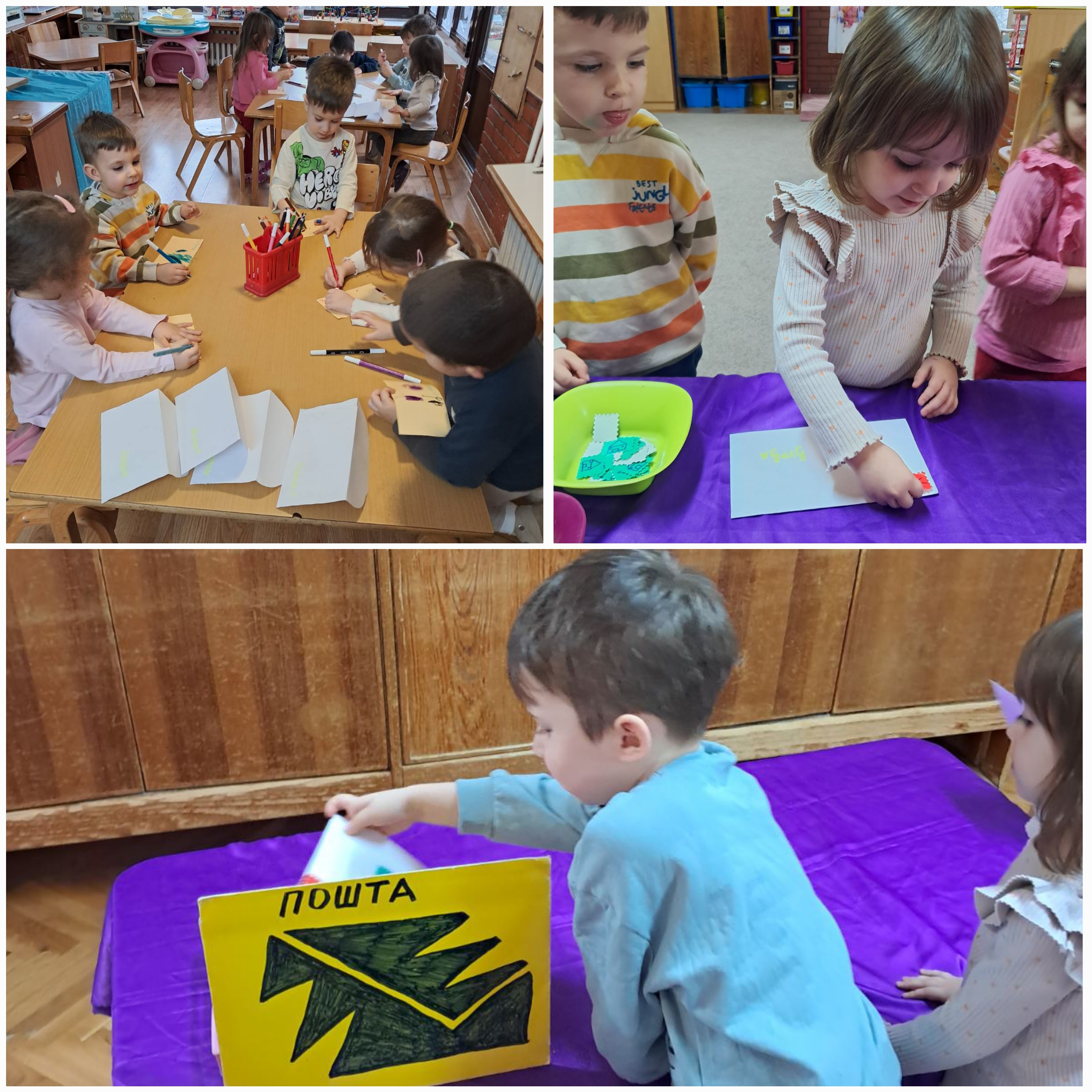 Ситуација учења започела је писањем писама. Деца су са великим узбуђењем цртала и „писала" поруке, затим су лепили марке и ,,писали" адресе, учећи чему оне служе и зашто су важне. Када су писма била спремна, убацили смо их у поштанско сандуче.